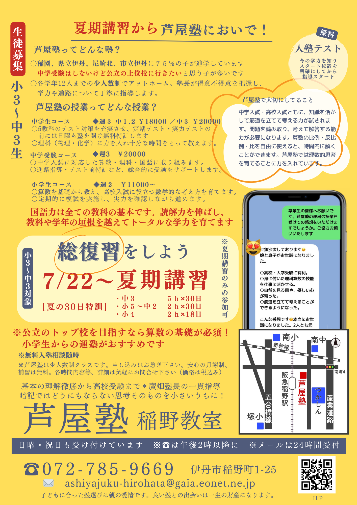 「芦屋塾稲野教室」では、伊丹で子供たちを指導して30年余りという塾長自らが、全学年(小3〜中3)の全教科をていねいに見てくれます。