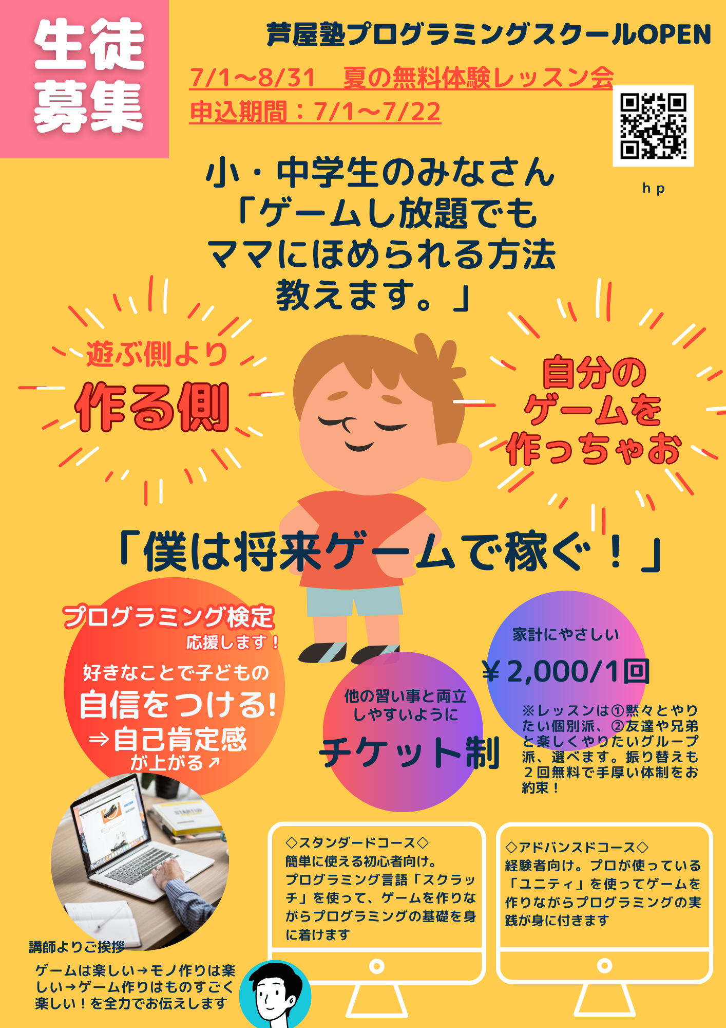芦屋塾プログラミングスクールでは、オリジナルテキストを通して実際に遊べるゲームを作りながら実践的なプログラミング技術を身に着けることができます。